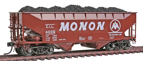 Стандартный 50-тонный двухбункерный открытый хоппер тип AAR с грузом угля. Вагон выпуска 1954 года. Принадлежность Chicago, Indiapolis и Louisville (MONON) #4006. Вагон с великолепной деталировкой, вплоть до установленных отдельных пружинках в тележках, тормозных шлангов и т.п.