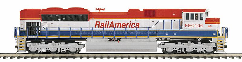 Тепловоз EMD SD70M-2 аналоговая версия. Имеется разъем под установку стандартного DCC декодера. Принадлежность Florida East Coast #107. В кабине - фигурки машиниста и помощника, свет в прожекторах и номерных таблицах, освещение в кабине. Минимально рекомендуемый радиус 18" (457 мм). Может использоваться как на рельсах высотой 2.1 так и 2.5 мм.